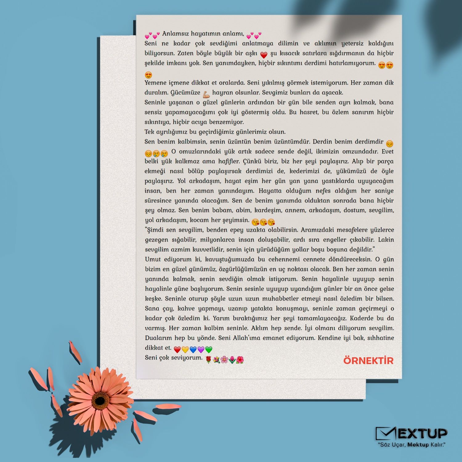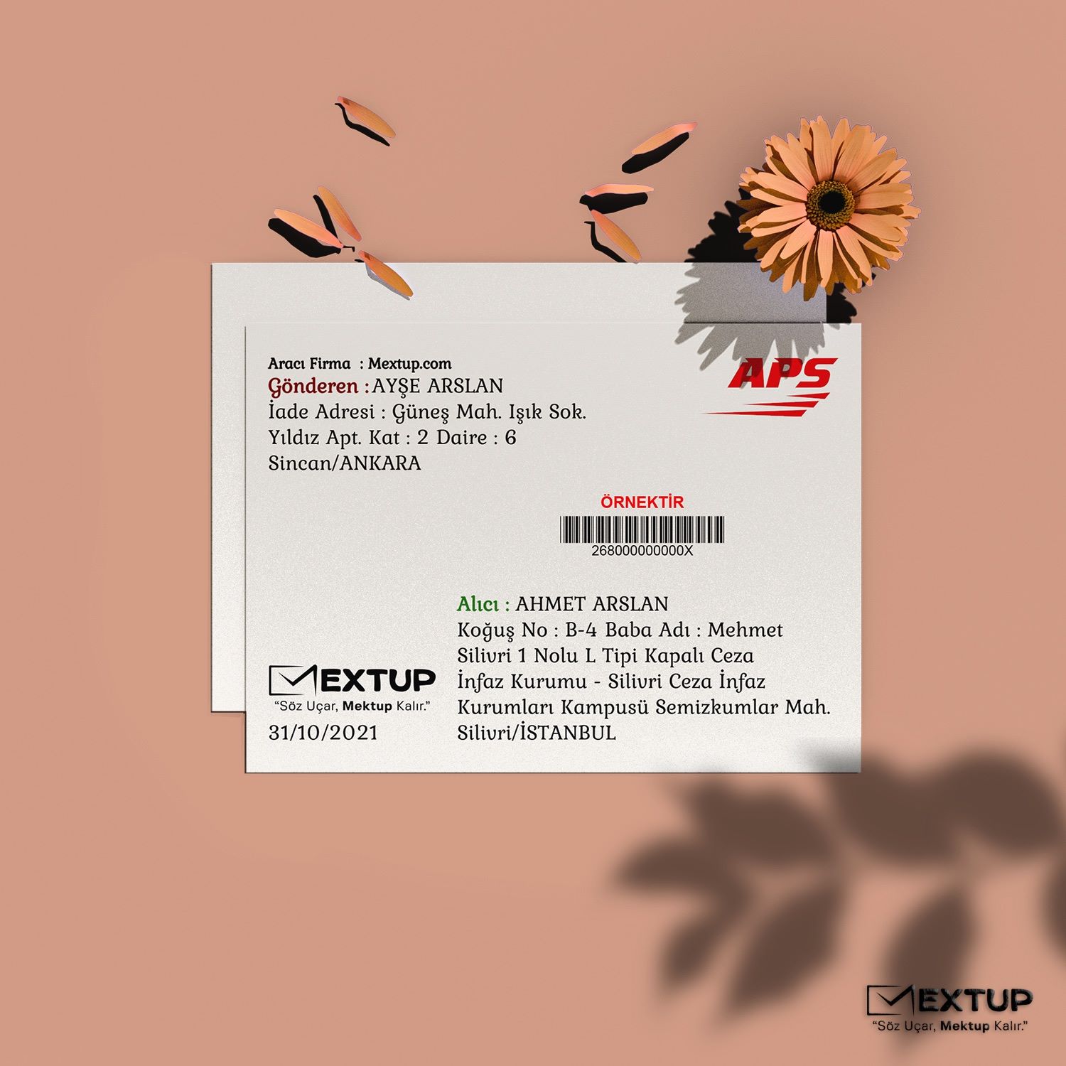 Mextup oturduğunuz yerden mektup, fotoğraf, belge ve kartpostal gönderebilmenizi sağlayan, kullanımı kolay bir uygulamadır. Mektubunuzun fiziki hâli posta yolu ile alıcıya gönderilir. Siparişiniz yola çıktığında takip kodunuz SMS olarak iletilmektedir. Fiyatlarımız 260 TL'den başlamakta olup adrese teslim süresi ortalama 2-3 iş günüdür. Alıcı adresi cezaevi veya askeriye ise alıcının eline geçme süresi ilgili kurumun prosedürlerine göre değişiklik gösterebilir. Hafta içi 16:30'a kadar verilen siparişler aynı gün kargoya verilmektedir.